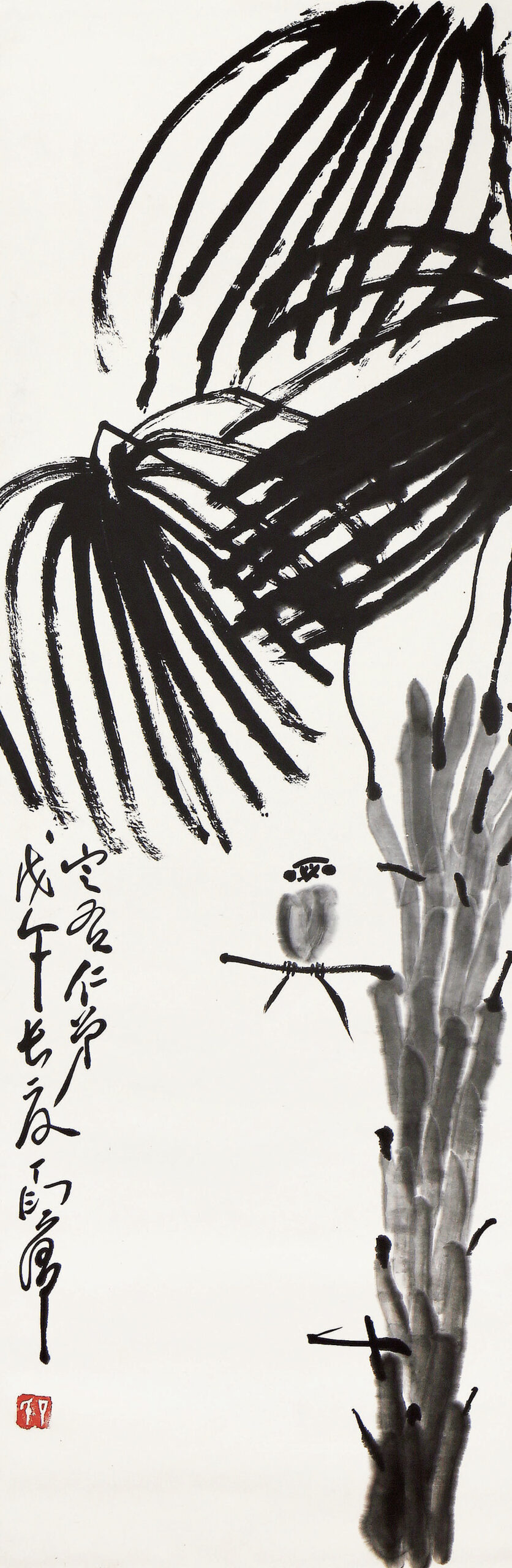 此丁公佳作,貫通中西之寫法,實是丁公風格之獨特表徵。構圖簡括,意境深遠,以大寫意淡墨寫樹幹,並以不同墨色繪葵葉,每筆均表現出能量與生命力,向四周圍空間發放,筆筆如鑄劍。此乃丁公心與力之融入,為畫壇鮮見。丁公寫鳥,簡煉如八大山人。此畫在葵樹横枝上佈一燕子,濃墨點出喙與眼,鳥正視而立,彷彿與觀者互動對望,妙趣横生,使人觀其畫而覺意味無窮。