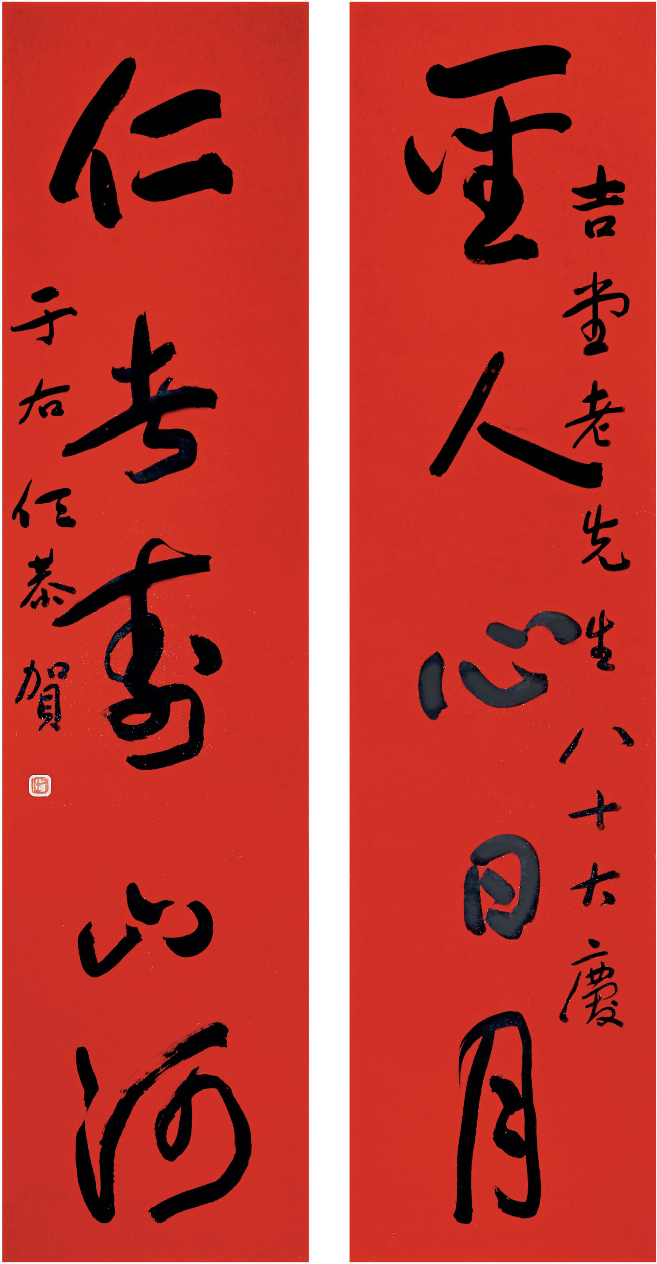 此聯乃髯翁奉賀吉堂老先生八十壽慶之作。余於該楹聯寫後四十多年,從吉堂後人處購得。本楹聯書於紅箋上,髯翁常書此聯句作賀壽禮品用。草字筆墨縱横,時顯遒麗跌宕之勢,自然而洗煉。聯句若龍盤鳳翥,隨意揮灑,剛中帶柔,拙裡見巧, 盡顯「于體」之美。