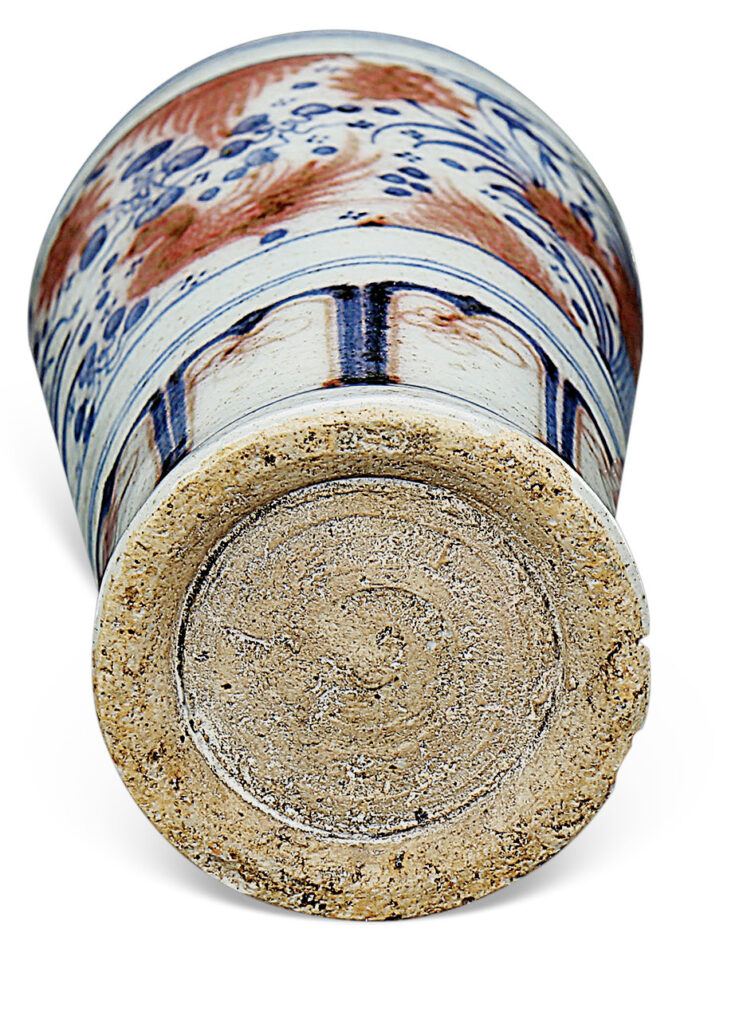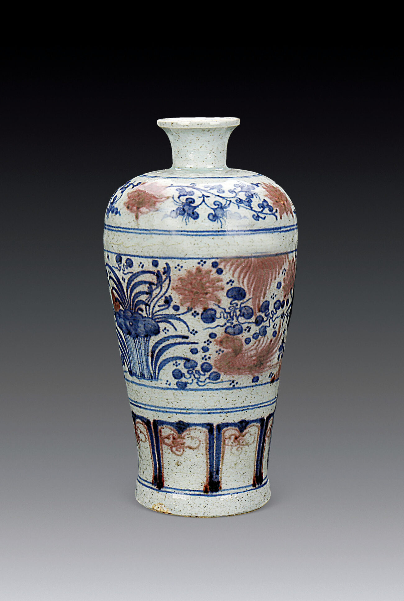 釉色如鴨蛋青,青花發色淡雅,釉裏紅不甚穩定,於青花線條中隱現凝聚點。脛部近底處留有浸釉時的指抓痕。畫藝精湛而純熟,揮灑自如。脛部變形蓮瓣紋見凝聚斑,用高倍放大鏡視之,有清晰之錫光網紋。凡此皆足證為元代之物。然而此器之頸部,與元代一般梅瓶頸部所呈上窄下寬之梯形,有所不同,或說雖是元代之物,但亦可能為元末明初珍品。