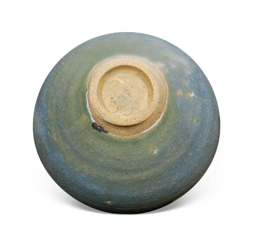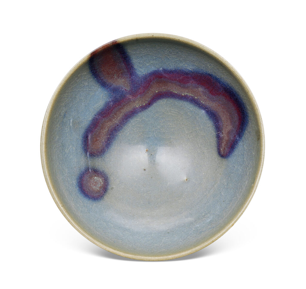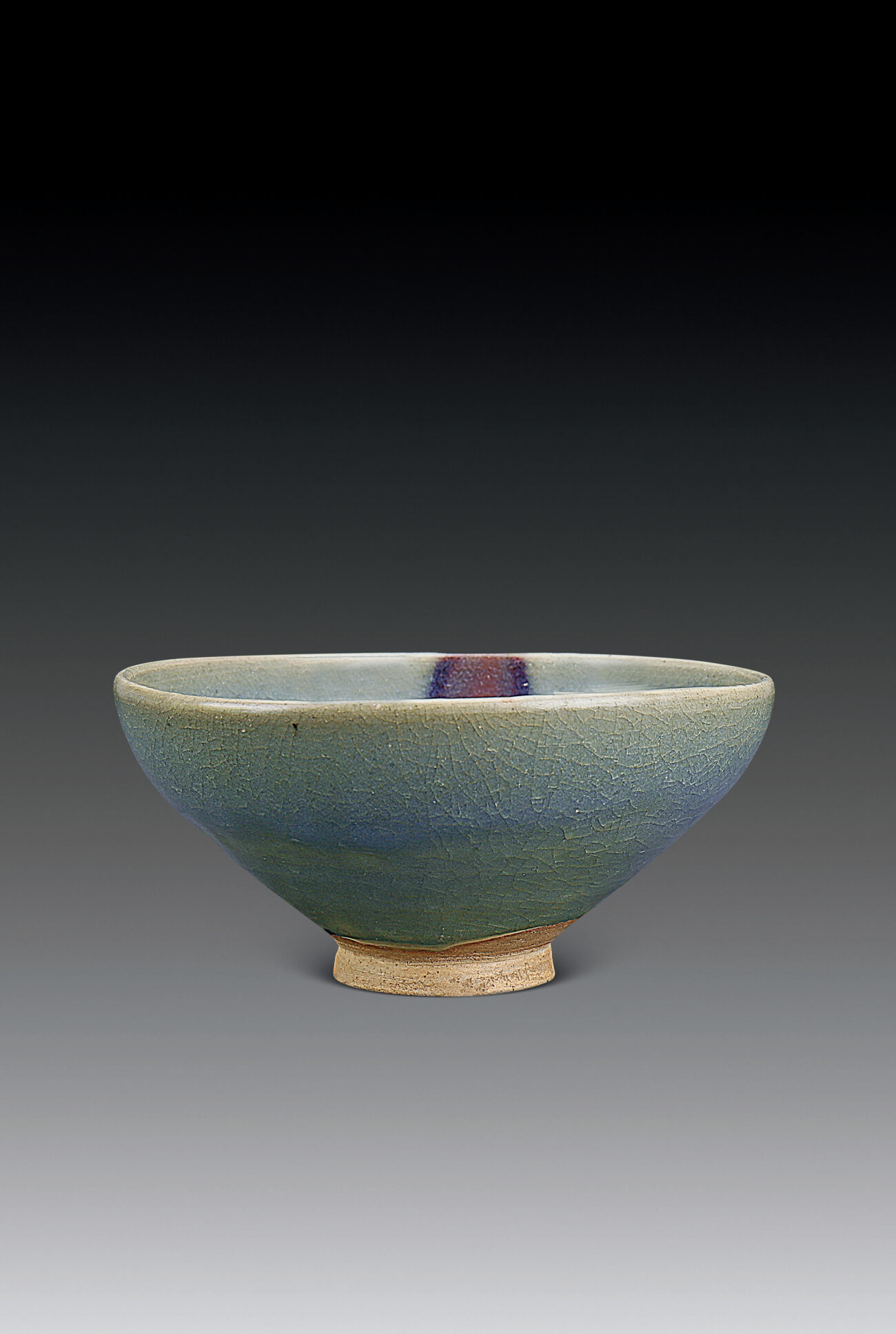 斂圓口、深弧壁、平底、矮圈足,足牆微外撇。施天藍釉,釉質濃厚,豐膄瑩潤,開淺色紋片,口沿一道米黄邊,施釉未及足。器身外壁見顯著之拉坯痕,整個底部連圈足皆無釉,圈足矮而寬,內緣高於外緣,外底有旋痕。凡此均是元碗之典型工藝。碗內紫斑環抱半個內壁,紫斑分現數層顏色,深藍、深紫、淺紫、鐵銹色等,天然成趣,非後世所能仿效。