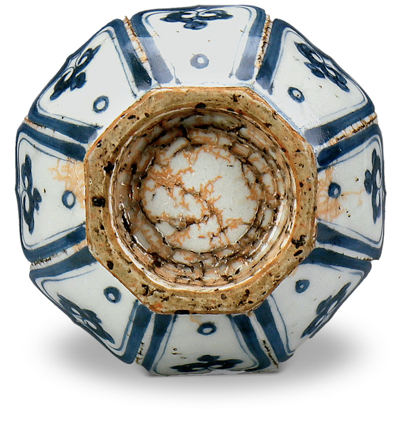 此器用本土青料,青花發色較暗,釉亦較薄,釉下白地顯見皺紋。外表舊味十足,口內、口沿及折角處均明顯爆釉。外底雖上釉、而旋痕仍清晰可見。足端露胎處見黑色金屬粒,及火石紅。
