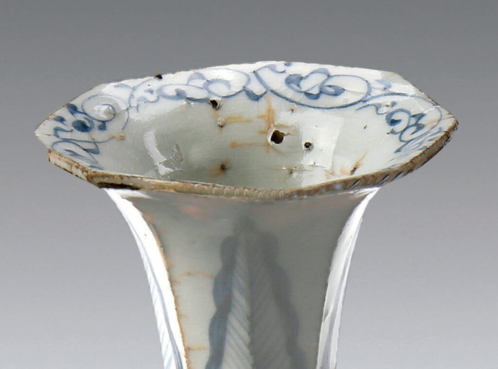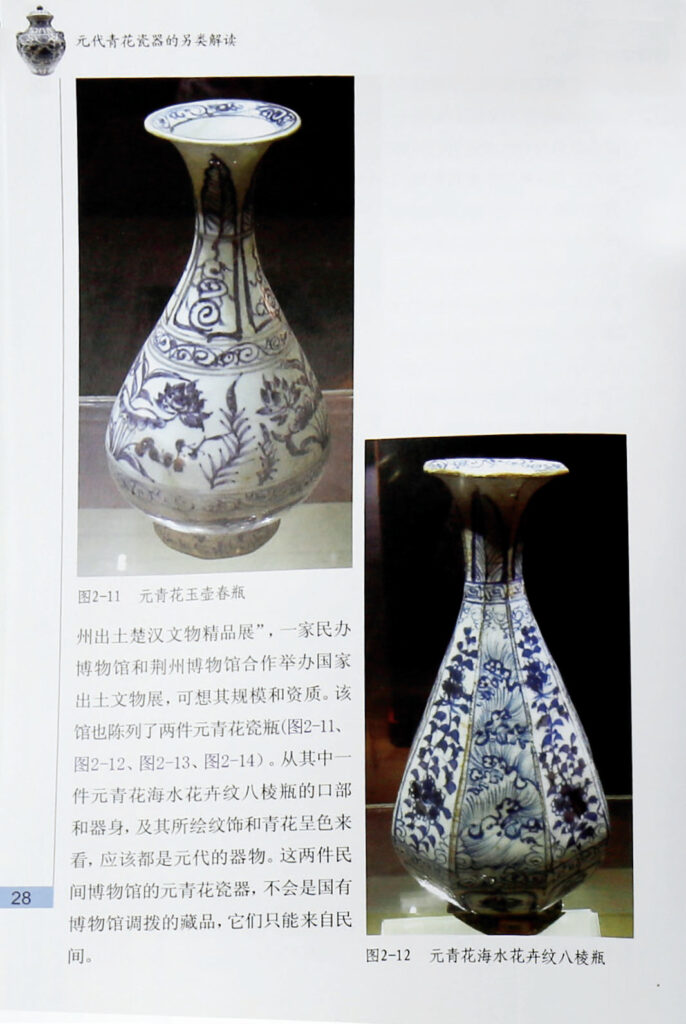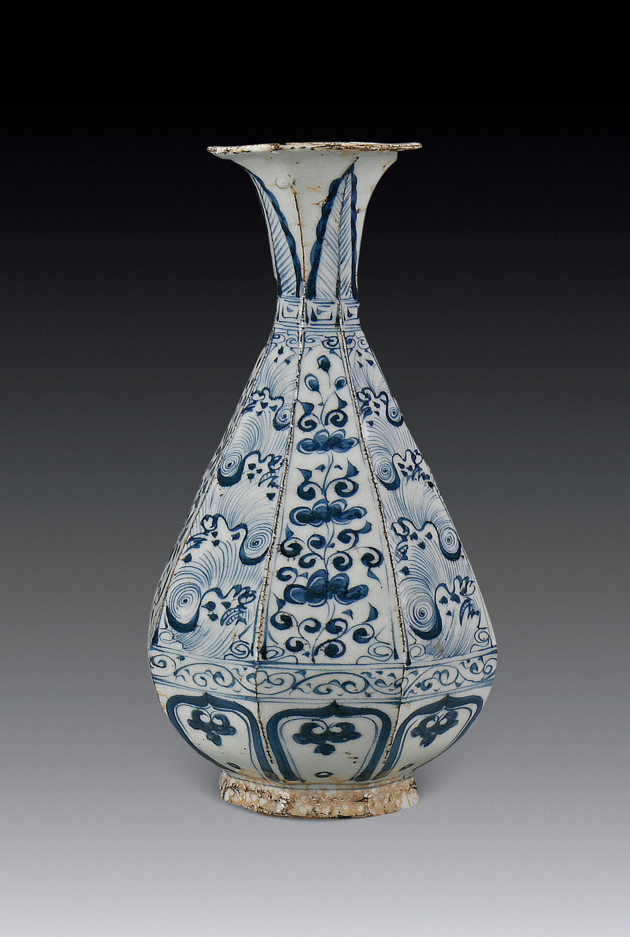 喇叭狀撇口,細長頸、溜肩、起八棱,垂腹如膽,圈足稍向外撇,釉底,足端無釉。器幅最大直徑是下腹部。造型俊秀優美,為典型的元玉壺春瓶式樣。