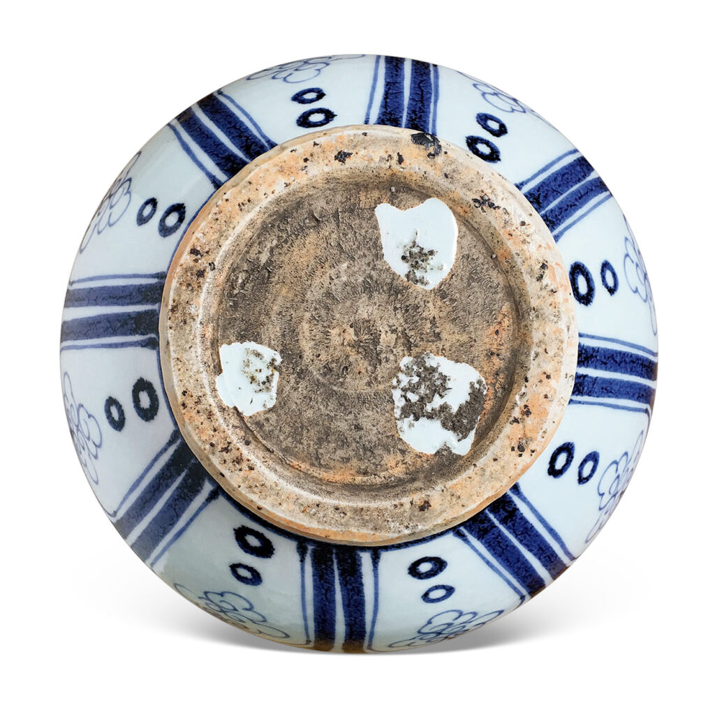 此器之鈷藍料為進口之蘇麻離青,發色藍中帶紫。積青處處,天然成趣,且鐵銹斑漬溢在濃厚的凝聚斑面之上。