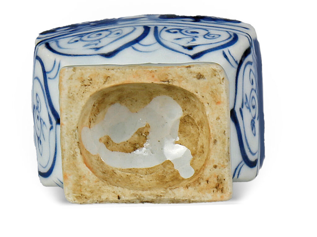 全器紋飾用進口鈷料,筆意嫺熟,線條豪邁自然。器身釉色白中帶青,釉質豐潤,滑如堆脂。於青料濃厚處見凝聚斑, 用高倍放大鏡觀之,錫光清晰可見。器外底有釉斑和淡淡的火石紅。