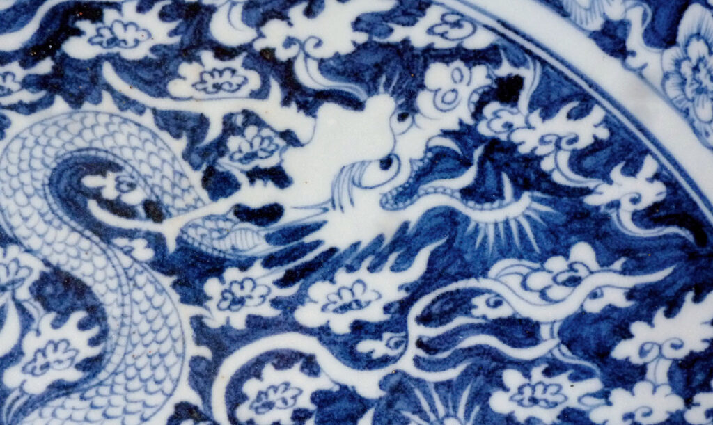 此器主題紋飾是飛龍乘雲,式樣亦見於土耳其托普卡柏博物館所藏之纏枝龍紋菱花邊大盤。兩者主題大同小異,只是本器之祥雲較疏朗而已。