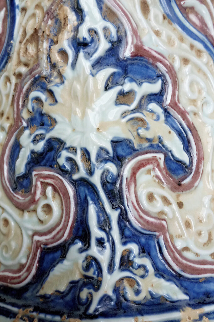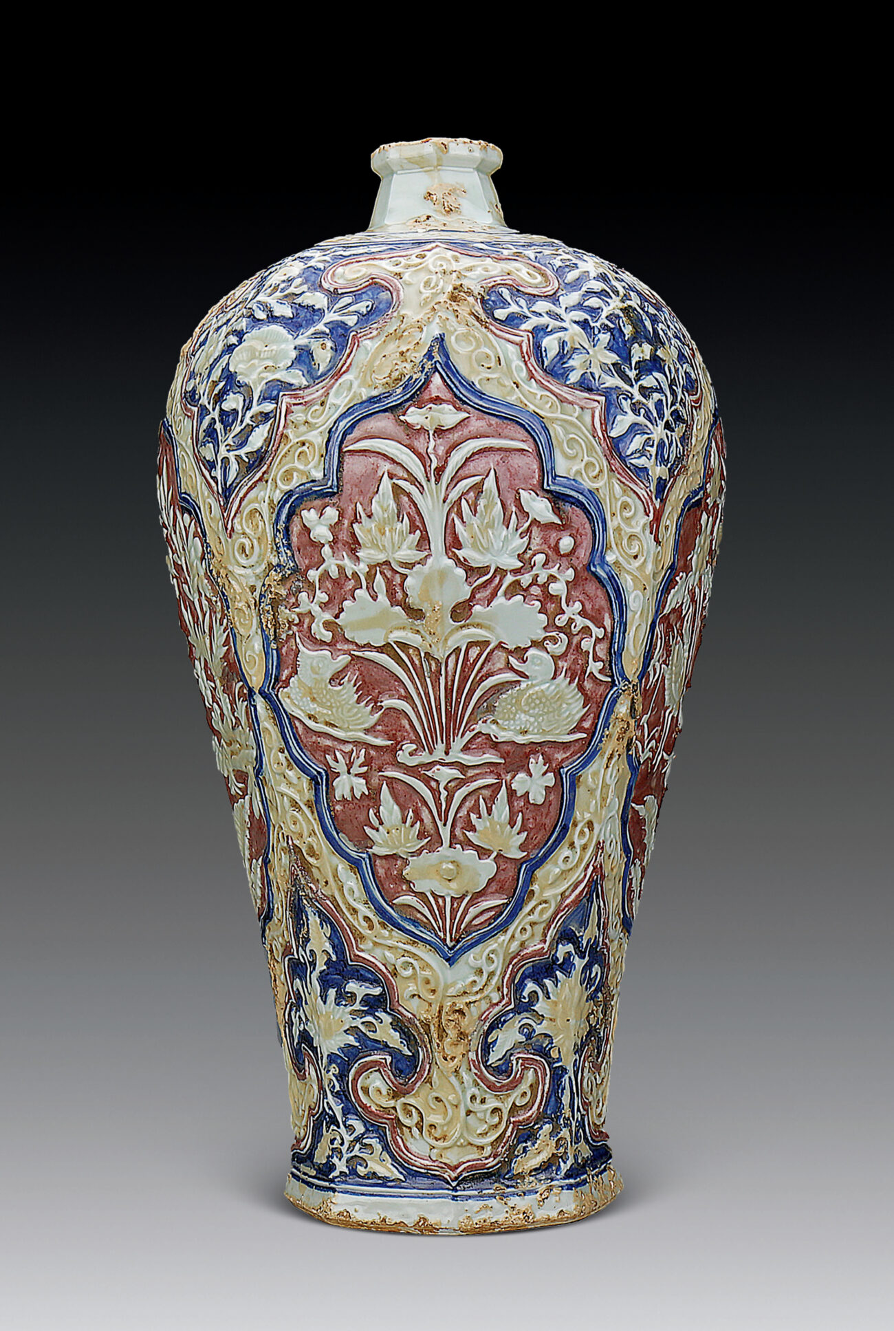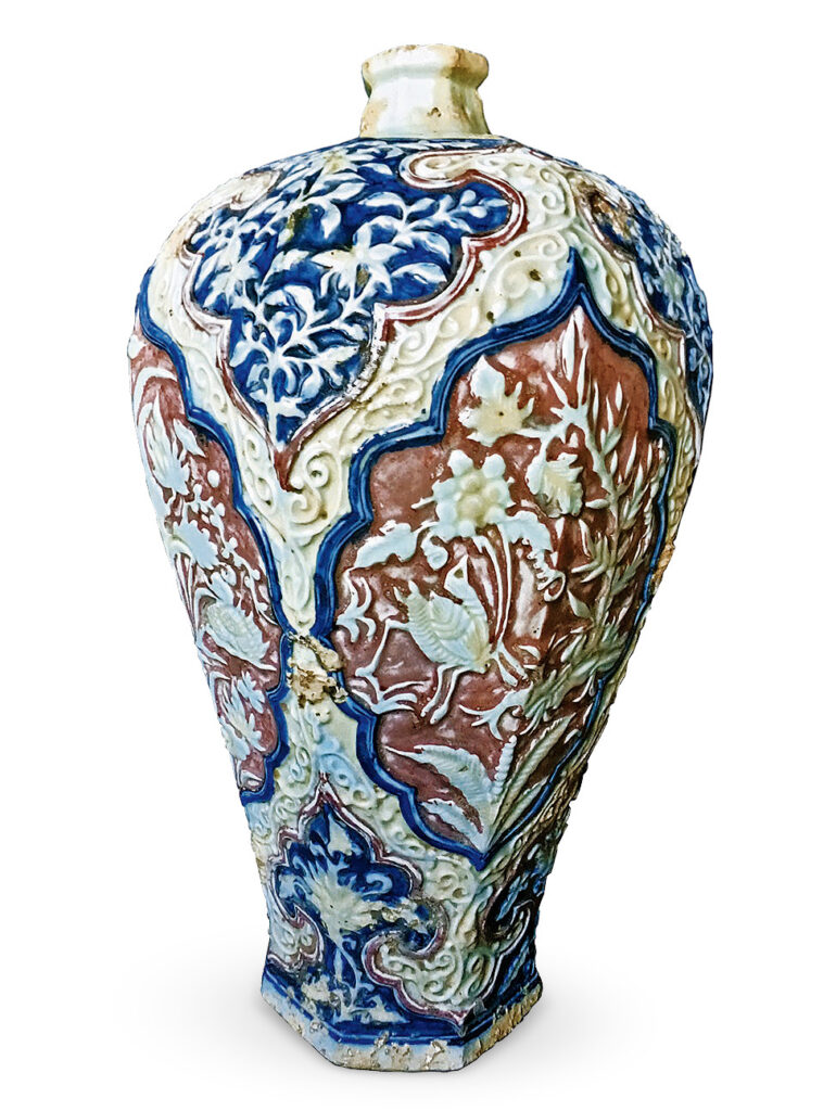 八棱梅瓶是少見的元代特殊型制,既保留了梅瓶的端妝優雅,又揉合阿拉伯地區金屬器皿上的凸棱,使整體器物呈現出剛柔並濟的造型效果。