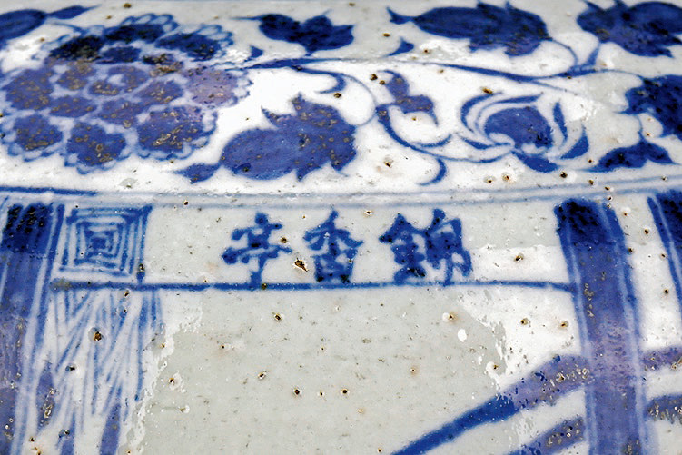 通體以進口鈷料繪就,釉厚而亮。主題之亭上匾額署有「錦香亭」三字。屬有題款之元青花,甚為罕見。