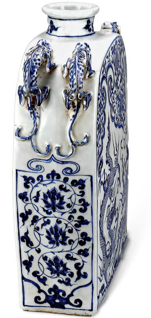鈷料青花發色青翠明快,長方底部露胎,圈足短而寬。北遼盛行皮囊壺,元代則獨創長方扁壺,二者皆方便攜帶,以適應遊牧民族逐水土遷徙之用。皮囊壺器身有一孔,而長方扁壺兩肩側各有兩繫,利於穿綁, 實用又方便。