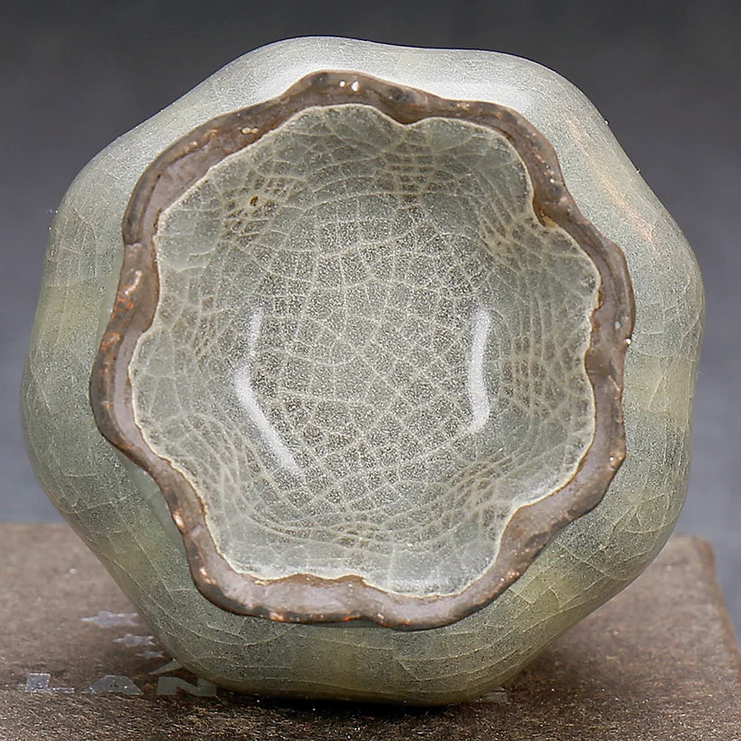 全器滿施青釉,胎體呈深褐色,釉及胎質均較厚,釉汁瑩潤亮麗,通體開紋片。胎土含鐵量高,故以手執之,覺較體積大小相近之瓷品為沉重。口沿及圈足均見剝釉,釉與胎體之接觸邊沿, 呈現一周因瓷體老化而產生的白線。