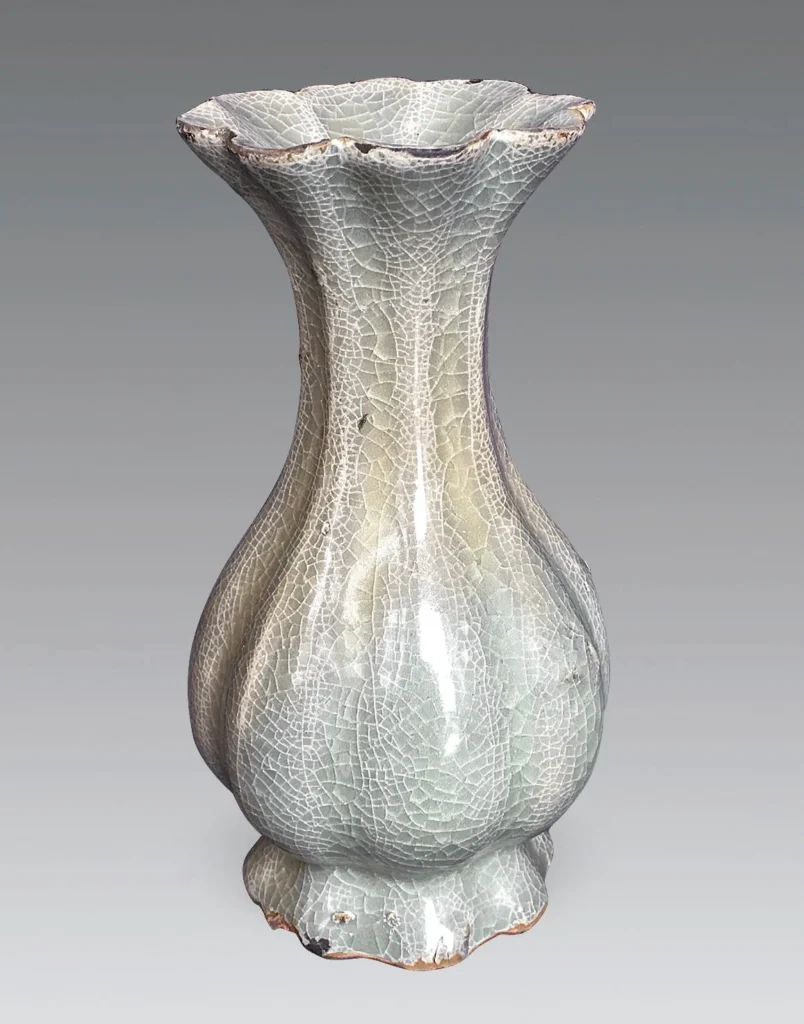 此對瓶呈八棱瓜型,喇叭口、束頸、鼓腹,高足脛,脛外撇。