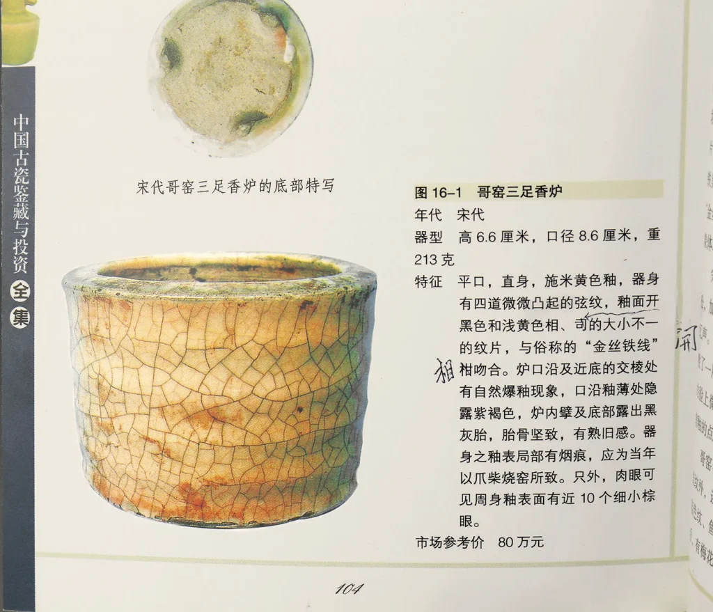 上海古籍出版社出版之《中國古瓷鑒藏與投資全集》第104頁 [圖16-1] 刋有另一砂胎哥窯三足爐。該物之器型、大小、開片等,與本器十分相似,幾同出一轍。