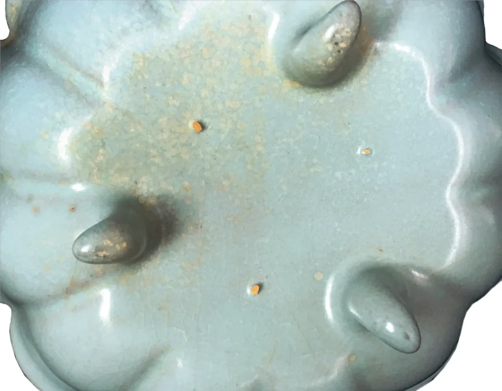 本品手藝精良,三足完全看不見其塑貼之痕跡,彷彿由內自然生長,蔚為天成。葵瓣造型典雅優美,器身隨口沿起伏,曲線流暢,棱角含蓄。若從審美角度來衡量,本品在宋代固然是一件創作品,至今歷久彌堅,其品相之完美於宋瓷藝術史上,應享有其重要的一席。