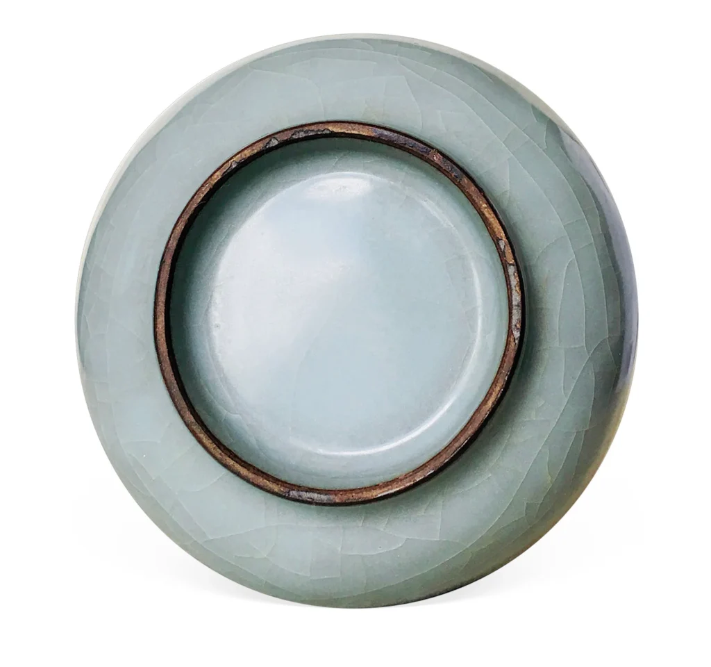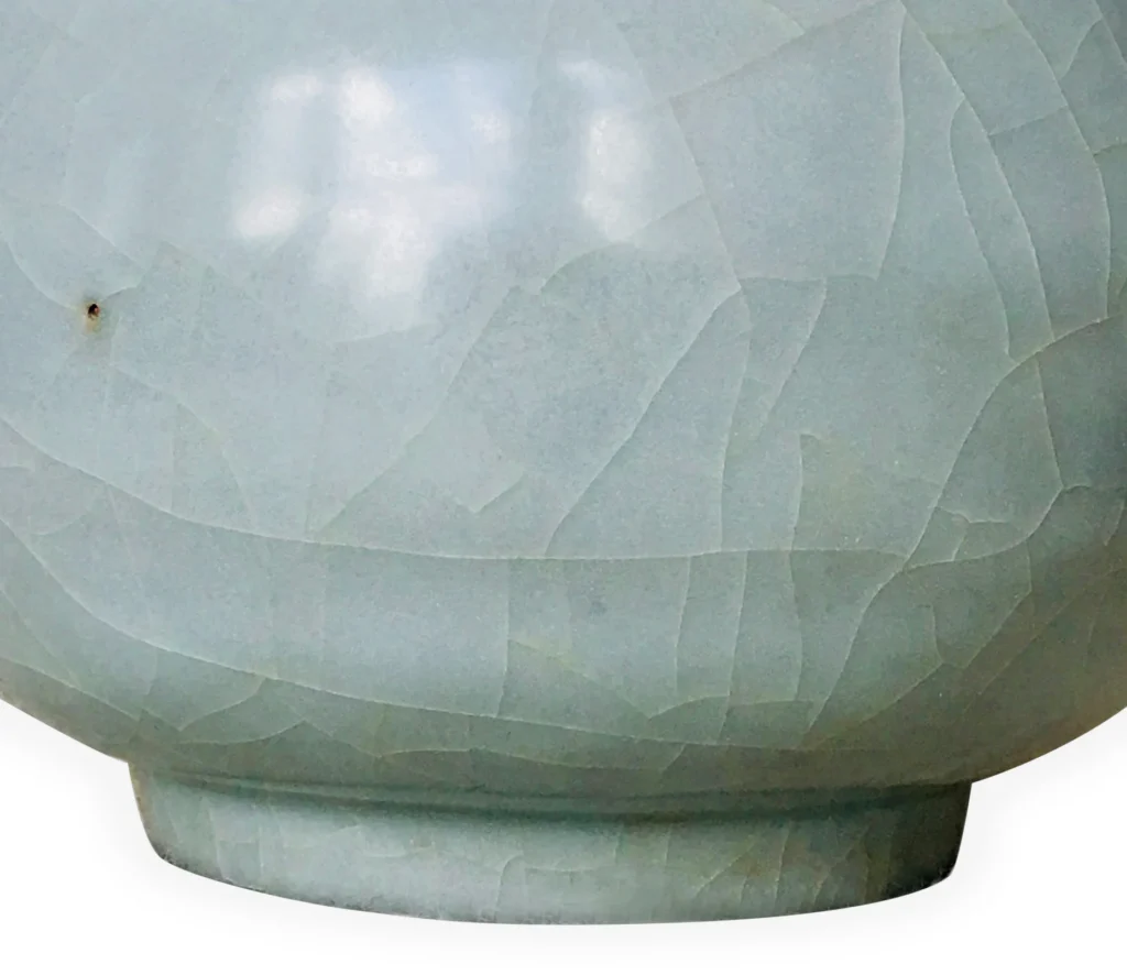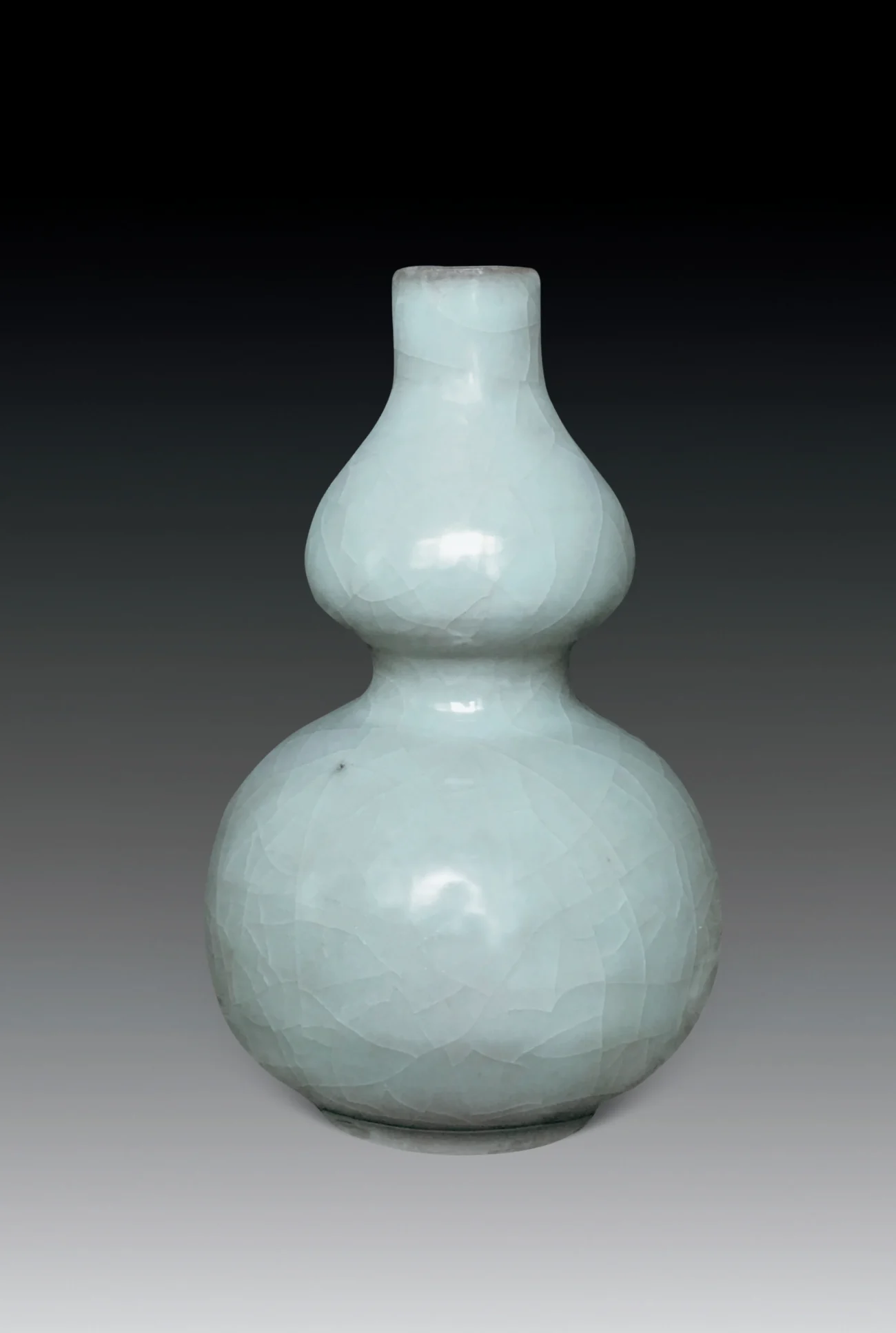 此器直口、溜肩、束腰,分成上小下大兩段,成葫蘆形,上下腰間能容一指。上段呈梨形,頸稍長; 下段鼓腹渾圓,横見幾度若隱若現之大旋痕。全器滿施粉青釉,釉層脂潤,似玉之質感,又似堆脂, 以手摸之,覺滑不溜手。釉面隱現大紋片,無色。圈足露胎,呈鐵褐色,足高1cm,足之裏外壁均外斜,於近腹底處之釉液較厚,於觸地處,因刮釉露胎,故釉稍薄,僅0.2cm。全器線條流暢,釉層厚而凝潤失透,盡顯宋瓷之雋美。