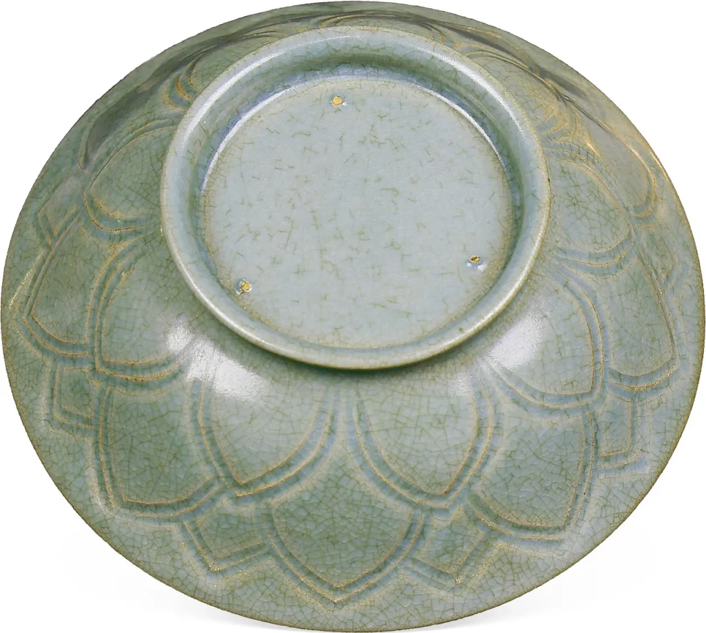 胎薄、撇口、斜腹,下腹內收,圈足外撇微捲。足徑與圈足交接處形成內彎之半圓形。全器滿施青色釉,碗內無紋,外壁刻蓮瓣紋,釉表不透光澤,然瑩潤內蘊,既顯高雅而又端莊灼華。開細密紋片, 如蟬翼狀,此種紋片,唯汝窯獨有,其縱横顯隱,於不同角度視之而有所變化。圈足裹燒,外底有三枚支釘遺痕,支釘斷口呈淡黃色,細小若芝蔴。