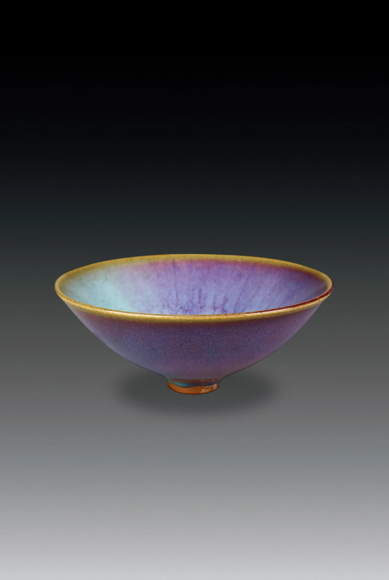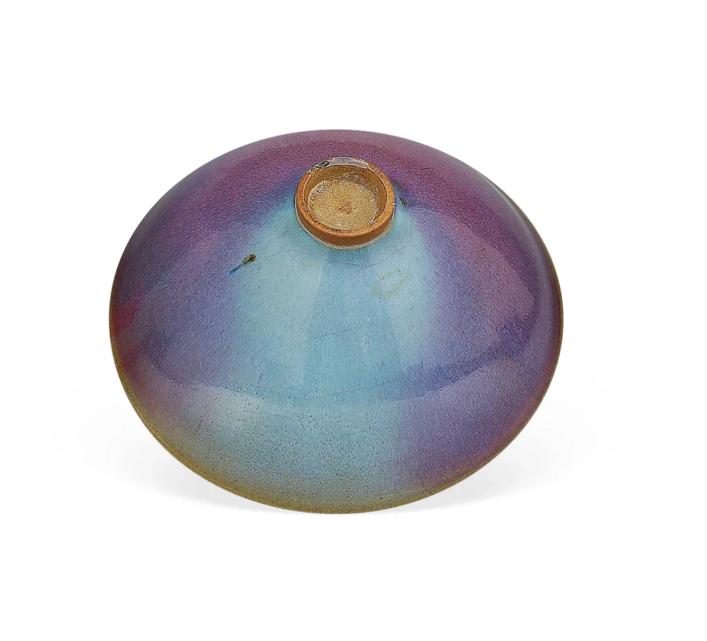 此器與一般之禹州鈞窯器稍異,胎質、釉汁及器型,皆有所不同。細圈足、淺弧壁,近似斗笠形。釉質厚實油潤,仿似堆脂。口沿內外呈規整的土黄邊,葡萄紫與天青釉色之交融等,均顯現其非凡之工藝成就,猶勝禹鈞。嘗有論者稱譽為鈞釉之冠,誠非虛也。
