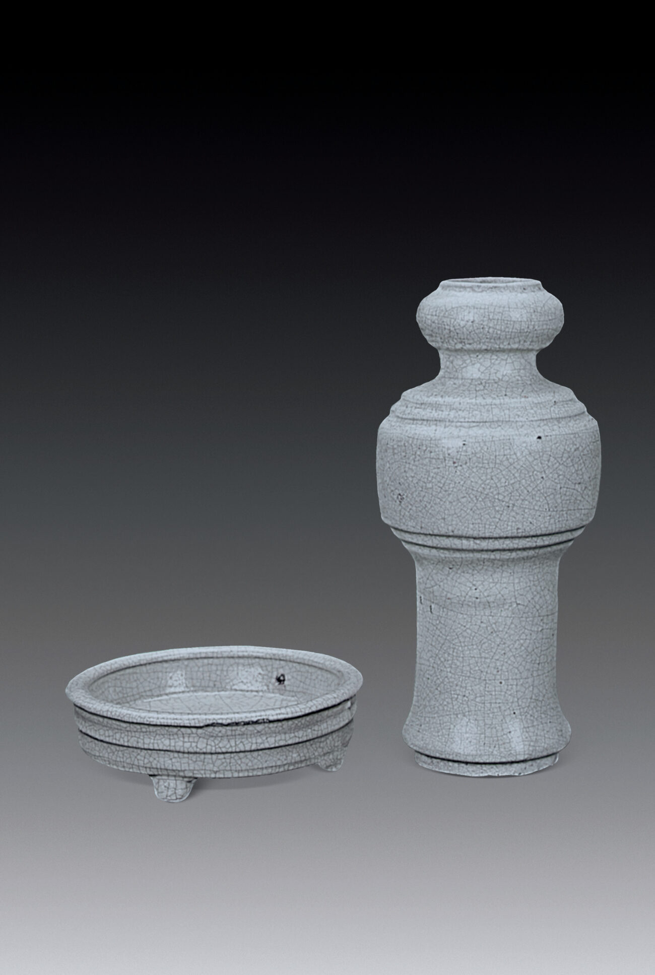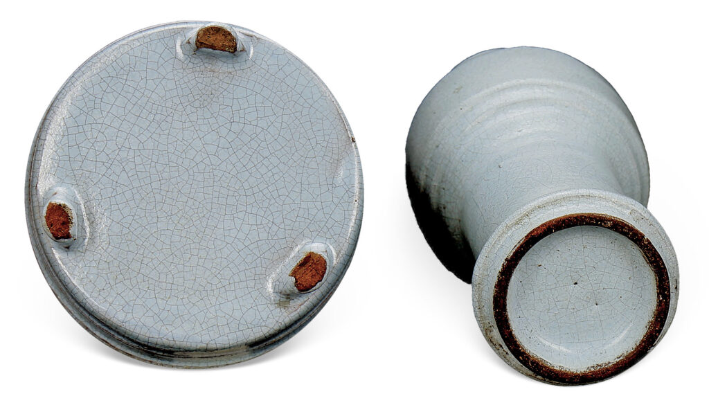 此瓶於工藝製作上仍襲元代遺風,分三段接合而成。胎骨為宜興紫泥。頭呈蒜形,厚唇、細頸、溜肩,分二級至腹部,腹呈短筒形,下部亦分二級收窄至脛部,脛部也呈筒形,細而長。圈足亦呈兩層。全器施淡藍色釉, 釉色瑩潤,光滑細緻,開片似汝釉之魚子紋。圈足無秞處現紫泥胎,神似鐵足。底無款。