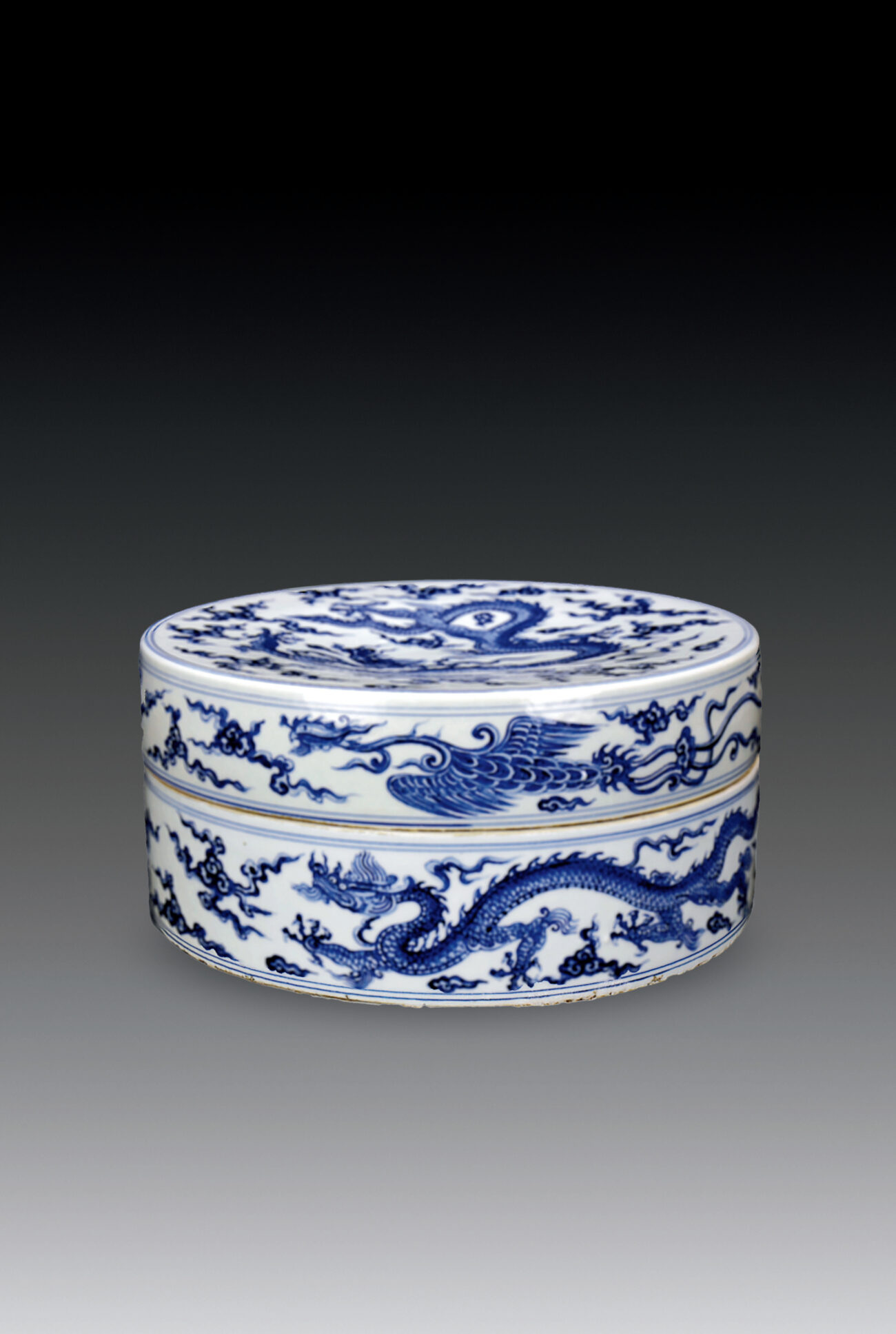 硯蓋面飾五爪騰龍,飛越祥雲。外壁一圈繪鳳凰一對,硯座外壁佈雙龍互逐。龍身色調,腹淺背深, 以示立體。硯之盒形規整。青花發色穩定,線條清晰細膩,畫工精湛,散見細小之鐵銹斑。釉色瑩潤,白中閃青,桔皮棕眼顯現。硯座外底,全是火石紅,滿佈礱糠遺痕。據此,雖無署款,也可足證為明代之宣德窯瓷硯。