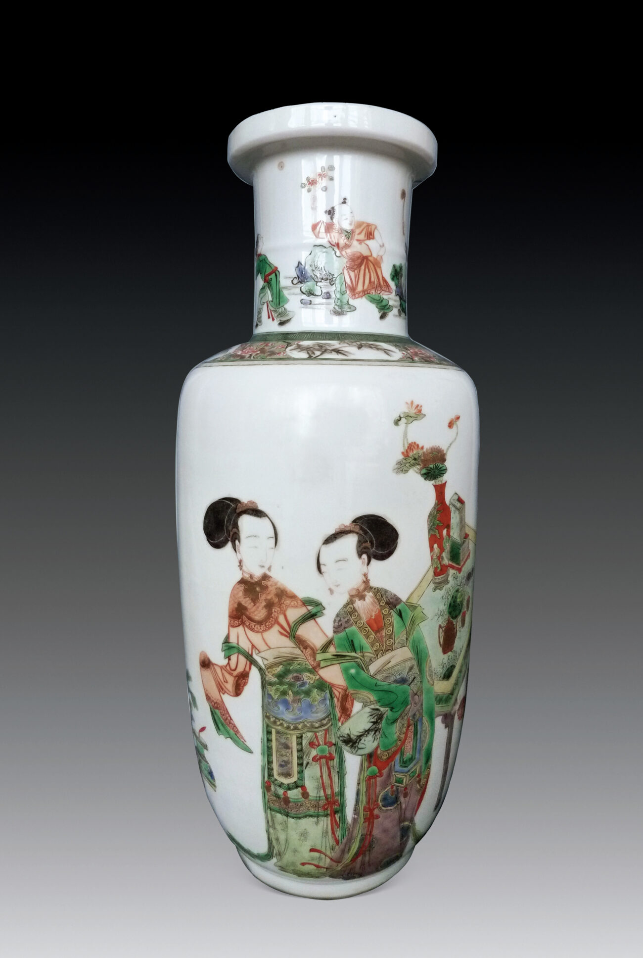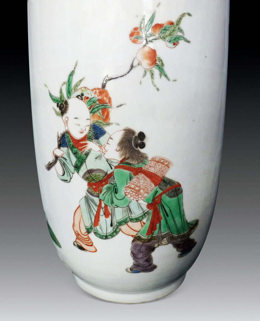 頸部繪三童子,手持花枝或如意,玩耍追逐。肩部頂端飾一圈綠地回紋,緊隨一帶以梅竹為主的輔助紋。器腹繪人物通景,正面二仕女,身形修長,頭梳髮髻,配以金彩髮飾及耳環,眉清目秀、衣服花紋細緻華麗。其前方放置蓮花盆,其後置一長書桌,桌上設壺、杯、硯、書,並有一礬紅着色的花瓶,瓶亦繪人物,可謂畫中有畫,瓶插蓮花,蓮枝挺秀,花葉爭姸。桌旁繪一童子,被粉蝶吸引着。近處再飾二童子在送賀禮 : 一童肩負一颇壯之桃枝,桃實大小分置,綠葉茂披 ; 另一童則背負用花布綑紮之夏果。圈足無釉,露白胎,見胎質細白潤澤。外底以青料設雙圈,內署雙行「大清康熙年製」六字楷書款。