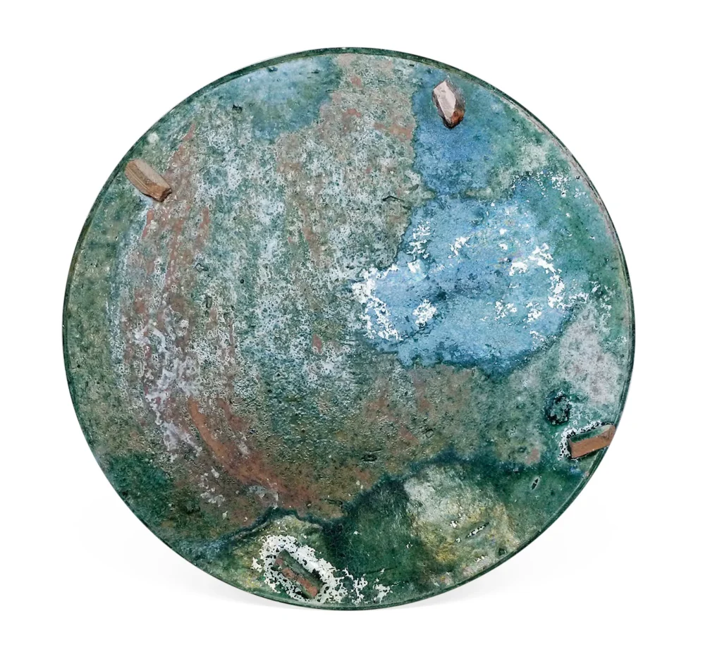 盤口、斂頸、斜肩、鼓腹,足脛內收。平底,設四根凸長形支釘。口沿除三支釘外,亦設若干鼓釘。