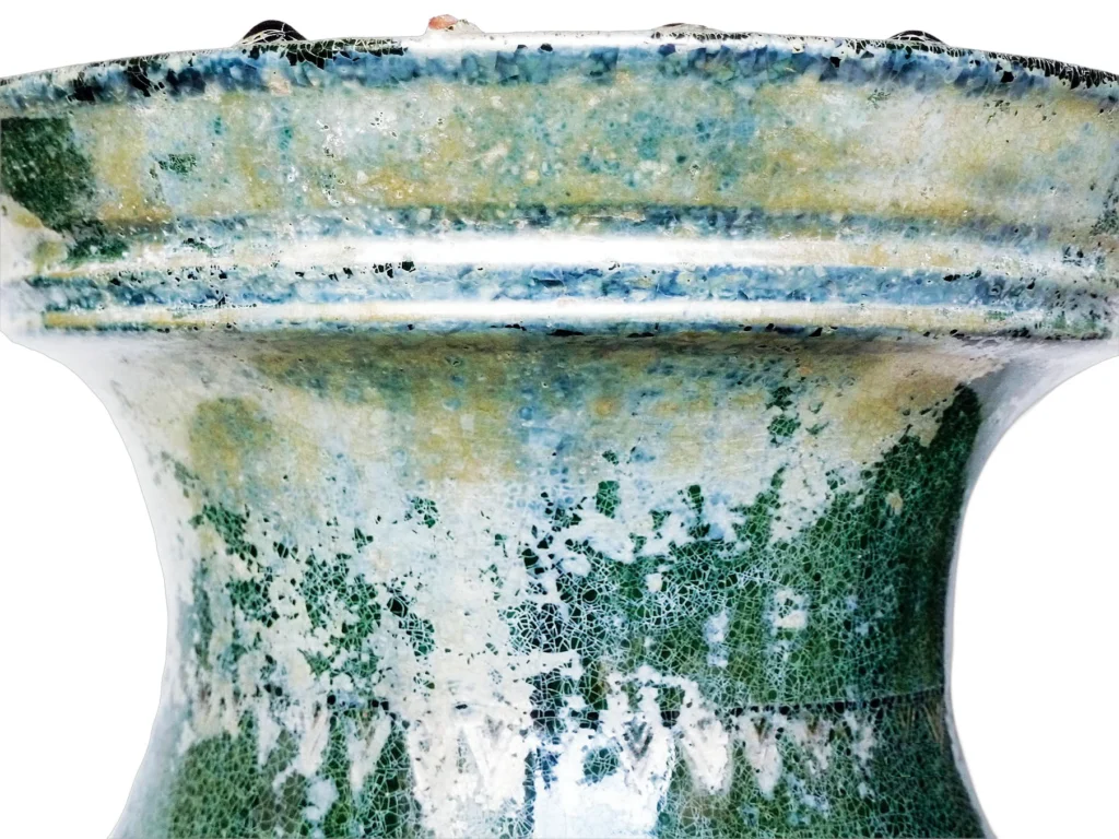 口沿外壁下端、肩部及腹部均設凸弦紋,頸部及肩部印刻有三角形錦紋一圈,腹部於兩面對稱處堆貼獸面舖首,横跨凸弦之上。紅陶胎,外壁全施綠釉,釉質亮麗,現細碎冰片紋。受土侵之影響,口沿及頸部外壁一周,呈頗大面積之水銀帶,厚而光亮。