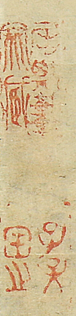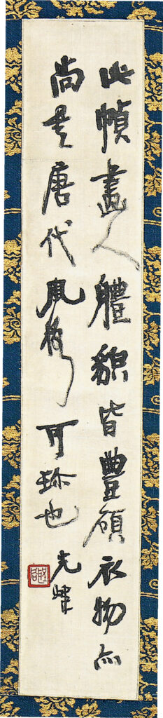 畫幅有三枚水印藏章 : 左邊為「居斯軒家藏」「子孫寶之」,右下角為白文「壽」字印,其下為近代大藏家及鑑賞家王季遷先生所鈐「季遷心賞」之印。另在畫旁左邊絹上,有余之師祖胡小石先生之題跋 :「此幀畫人體貌皆豐碩,衣物亦尚是唐代風格,可珍也。光煒」。