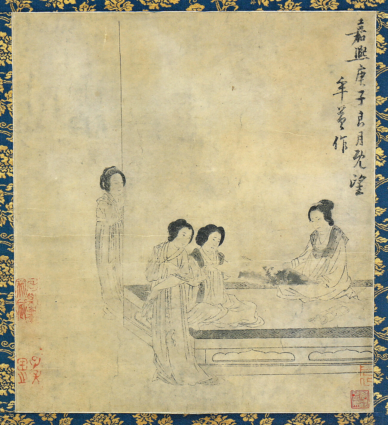本幅以淡墨白描,寫仕女四人賞畫之神態 : 二人盤膝坐矮榻上,凝神注目於一幀山水畫 ; 其餘一人立於旁,另一人則從屏風後探身窺視。四人體態豐膄,衣裙寬大,髮不露耳,凡此風神,均有唐人遺韻。宋元畫家,作品多不署名,而本幅右側上題「嘉熙庚子良月旣望牟益作」等字。嘉熙為南宋理宗趙昀年號,庚子即公元1240年。究此畫,或疑為牟益所作,而落款乃後人所為。