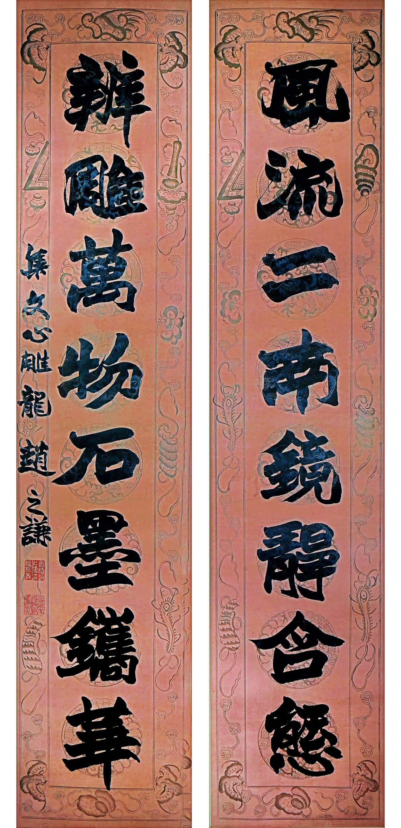 本品集《文心雕龍》句,成八言聯,寫於瓦當紋色箋上。以隸法摻北碑入行楷,別出時俗,結字緊嚴,密不透風。墨色濃潤,精神飽滿,極具個人之特色風貌,實為趙之謙難得之作。