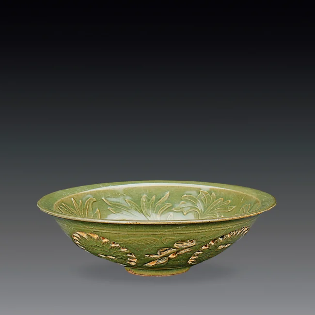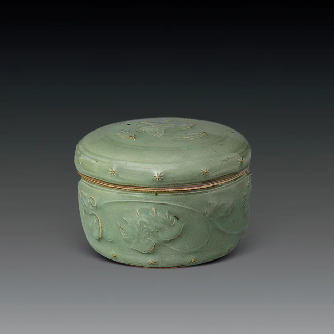宋 龍泉窯 雕花牡丹紋帶蓋罐