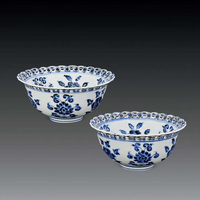 明 宣德窯 青花 鏤空飾邊折枝花果對碗