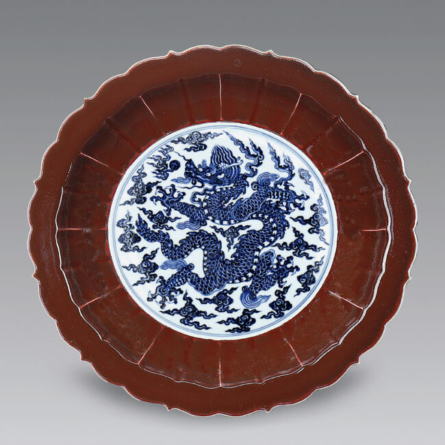 明 宣德 紅釉青花龍紋葵瓣式盤
