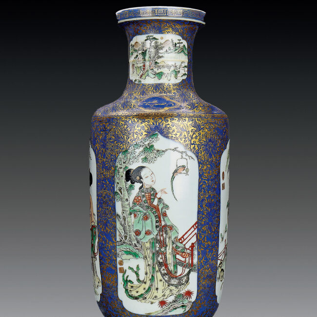 清 康熙 灑藍描金五彩開光四美圖棒槌瓶