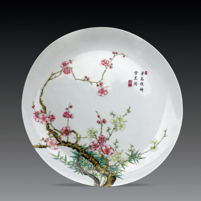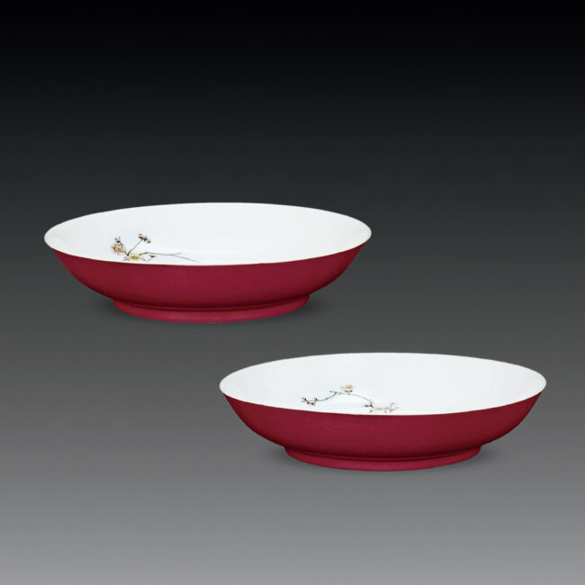清 雍正款 胭脂紅釉琺瑯彩竹梅靈芝紋對盤