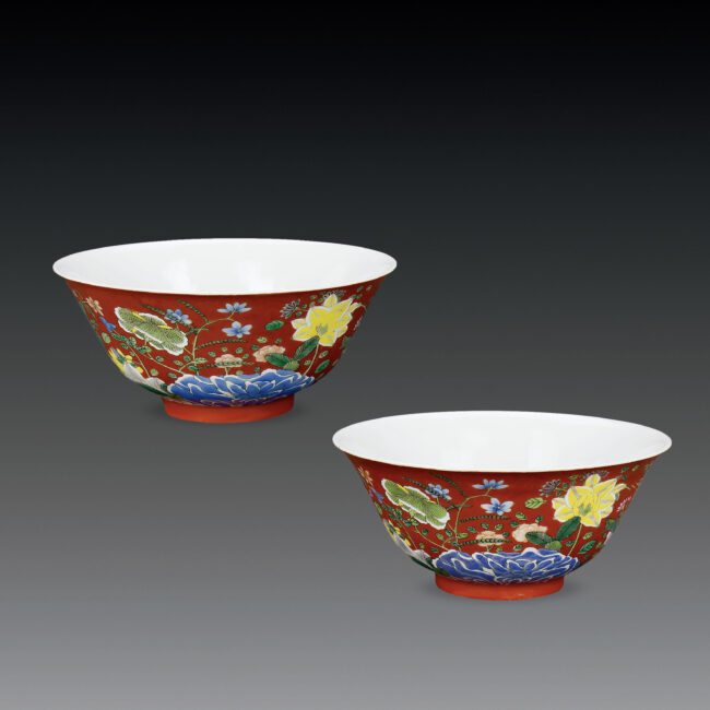 清 康熙款 珊瑚紅五彩九秋同慶對碗