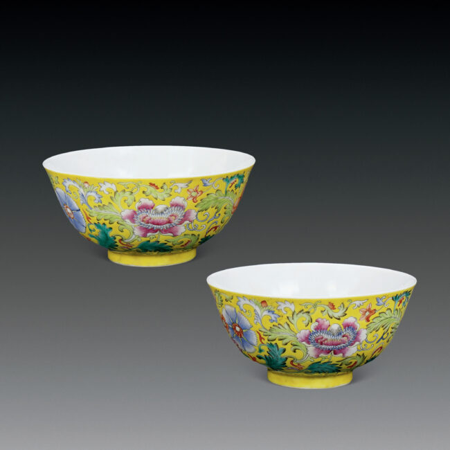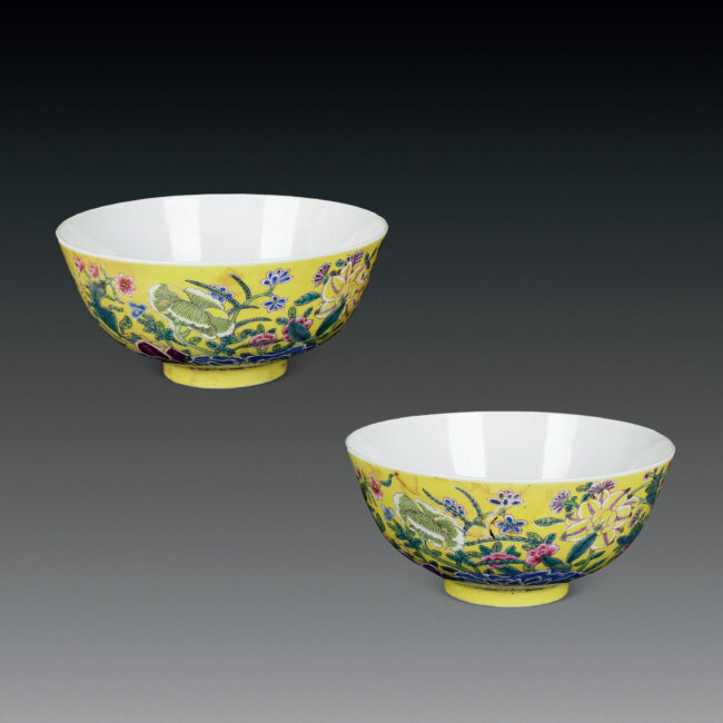 清 黄地琺瑯彩百花紋五福臨門對碗